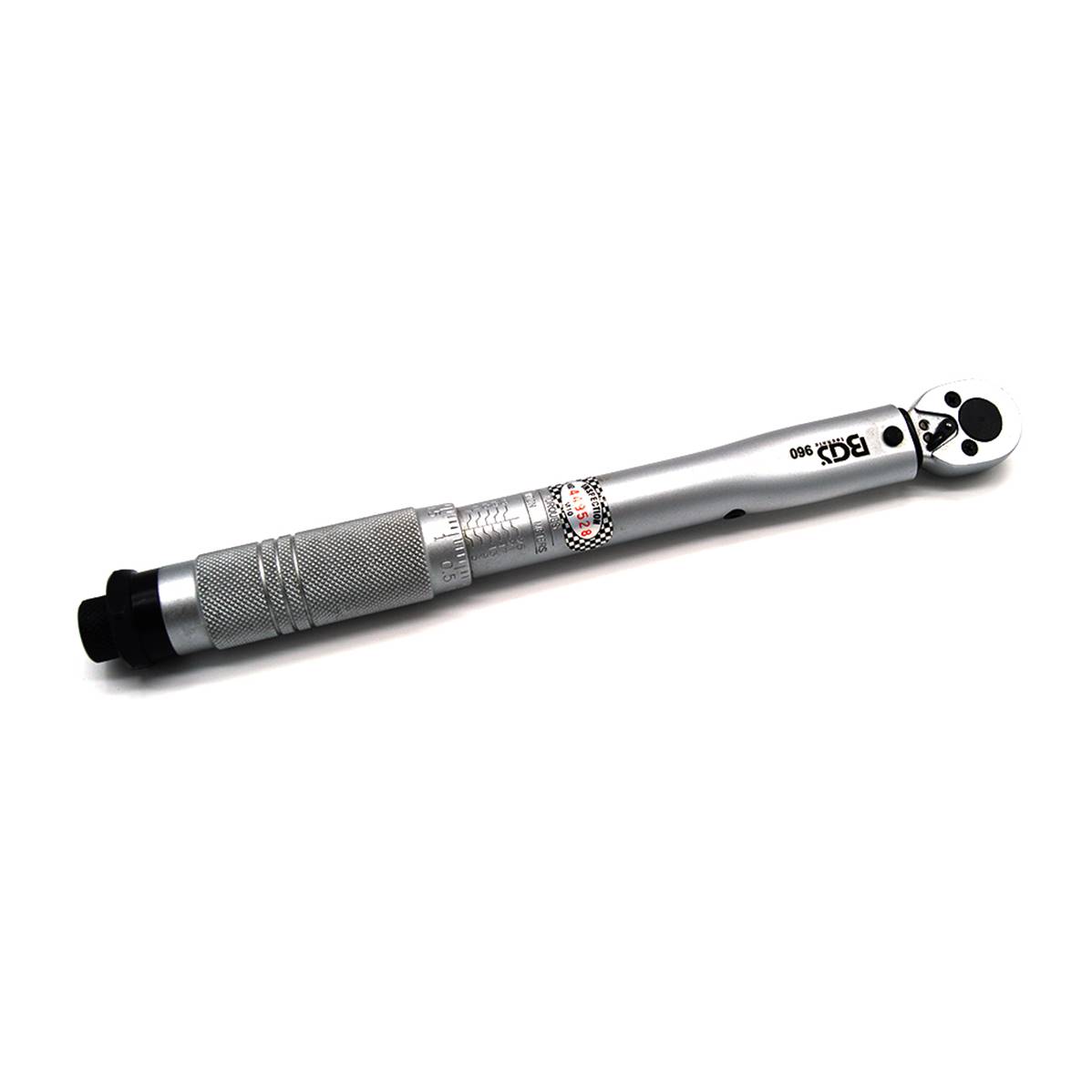 Cette clé dynamométrique vous permettra d'effectuer toutes vos opérations en un tour de main. Le réglage du couple de serrage se fait par poignée tournante, et se déclenche automatiquement de 0,51 à 2.55 m/kg (de 5 à 25 Nm).
