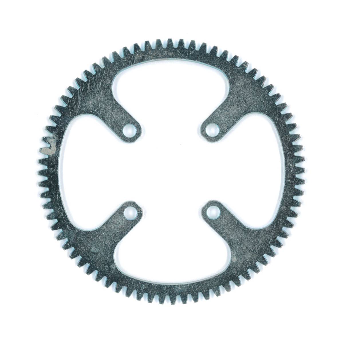 Couronne de démarreur 72 dents pour moteur Simonini Mini 4.Diamètre de 130 mm, épaisseur 4 mm fixation par 4 trous de Ø 6 mm avec un entre-axe de 57 mm. 16 dents