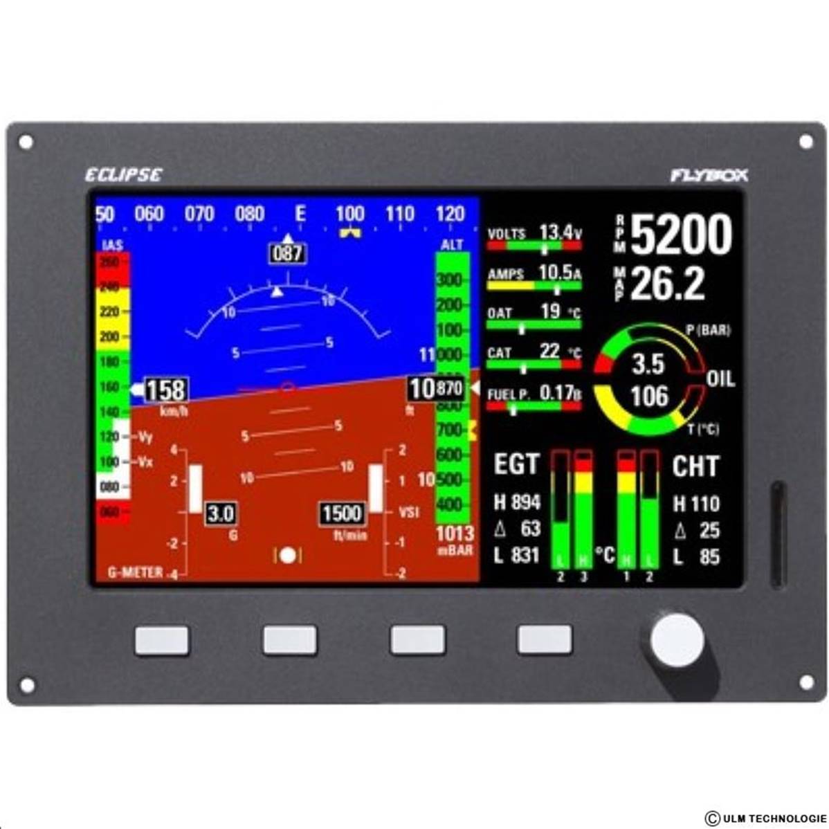 Caractéristiques principales de vol: Horizon artificiel / Altimètre (m ou ft) / Indicateur de vitesse air (km / h) ou variomètre (m / s ou Ft / min) / VSG G (m avec maxi boussole) / Pression atmosphérique / 3 entrées vidéo pour caméras couleur / liste de contrôle vocale / récepteur GPS inclus / sortie d'interphone audio / coordinateur de rotation / perle d'enregistrement de données.