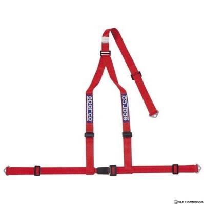 Harnais SPARCO 4 points rouge avec renfort ventral. Fixation par pattes boulonnées pour une installation solide et fiable. Réglages précis et simples : Ventral : 140 à 1400 mm - Épaules + fixation arrière : 100 à 2000 mm. Assure un maintien ferme, confortable et sécurisant pour cockpit ULM ou avion léger.