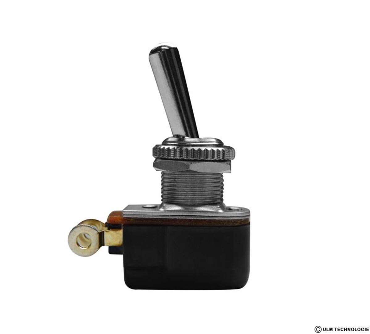Interrupteur simple 2 positions ON / OFF 12V - 5A Interrupteur à levier unipolaire, connexion par cosses à souder. Perçage panneau 12,5 mm.Possibilité de montage étanche par capuchon.
