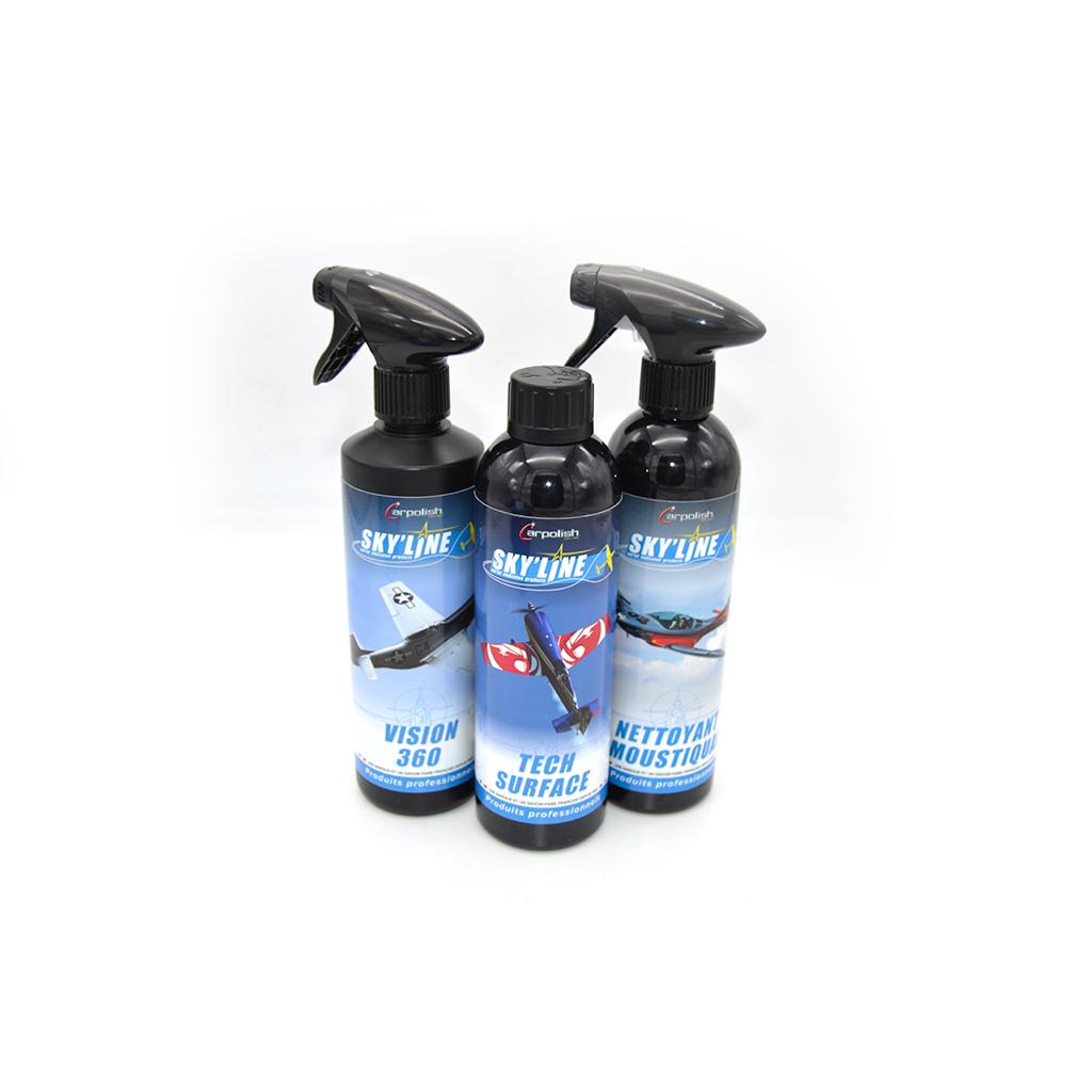 Découvrez Sky'Line... pour un nettoyage optimal et complet de votre aéronef : le trio d'exception pour votre aéronef ! Obtenez une brillance ultime avec le Tech-Surface, une propreté sans trace grâce à notre Nettoyant Démoustiquant, et une vue imprenable avec le Vision 360 pour vos verrières. Volez clair, volez propre, volez avec Sky'Line !