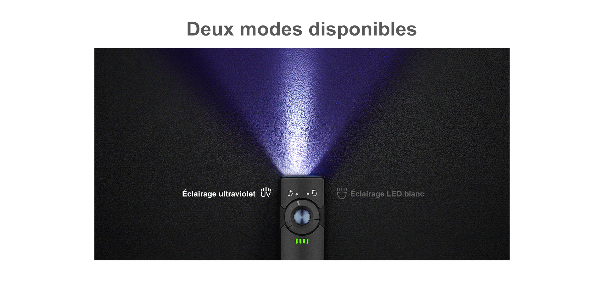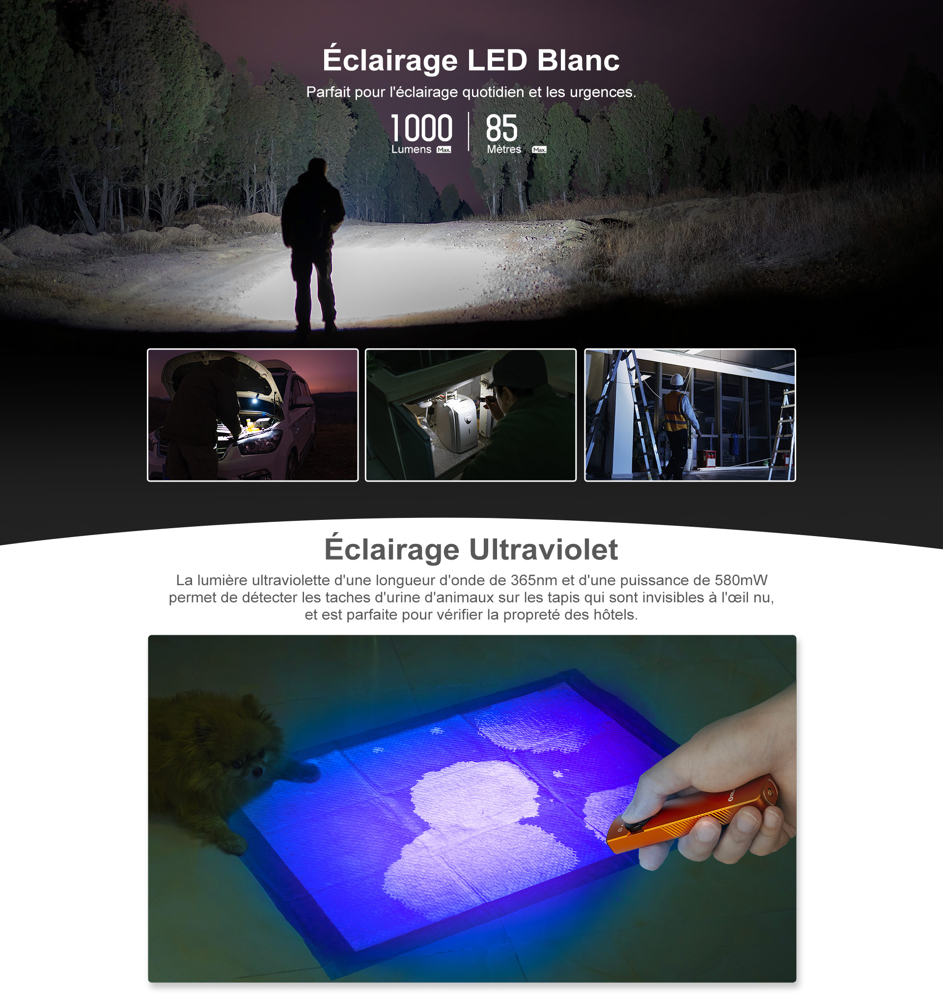 - Éclairage LED & UV : Profitez d'une puissance maximale de 1000 lumens pour un éclairage clair et efficace. La lumière UV avec une longueur d'onde de 365 nm permet de détecter les taches invisibles à l'œil nu, comme les traces d'urine d'animaux sur les tapis, et s'avère parfaite pour vérifier la propreté des hôtels ou pour d'autres inspections.