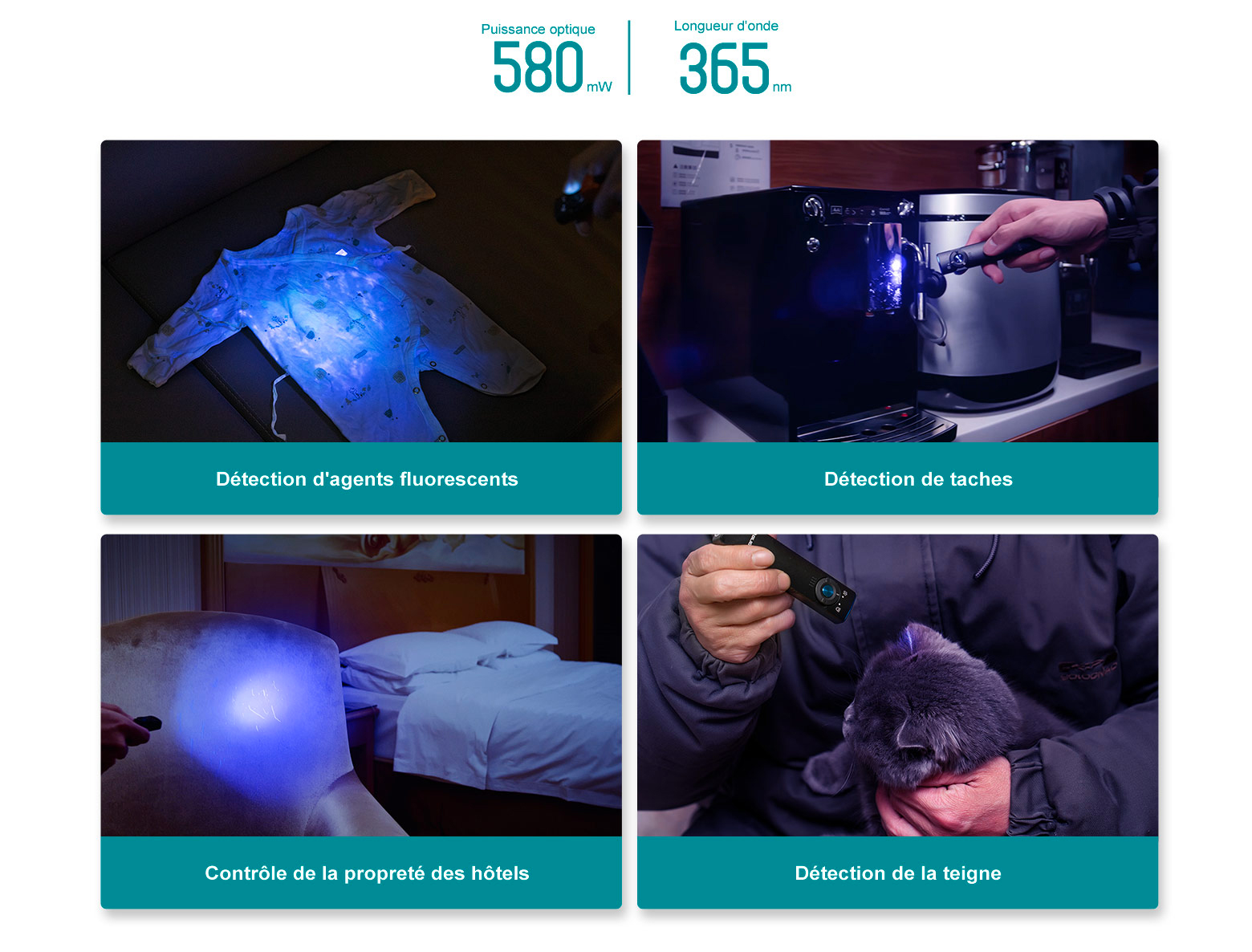Éclairage ultraviolet  Puissance optique : 580mW ; longueur d'onde : 365nm