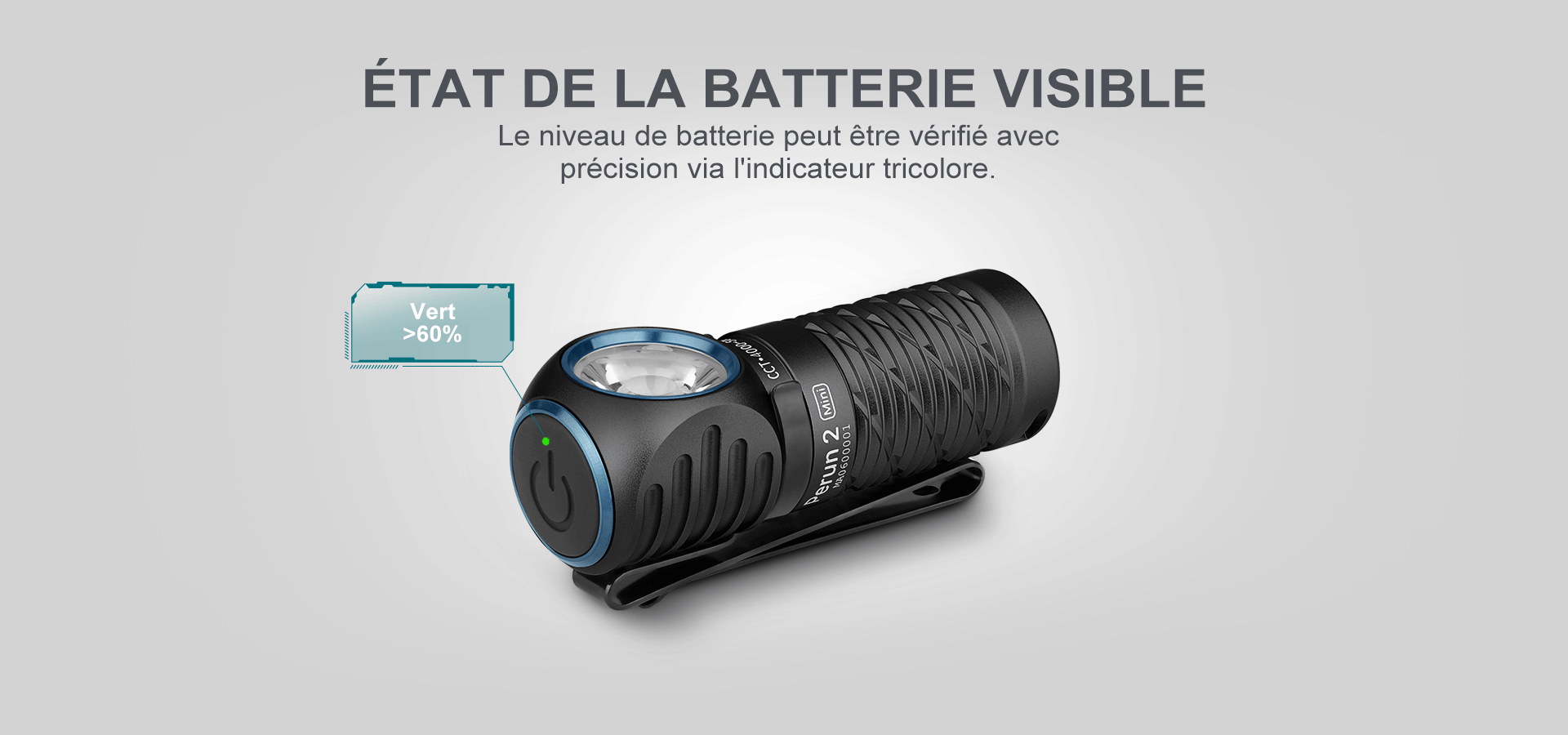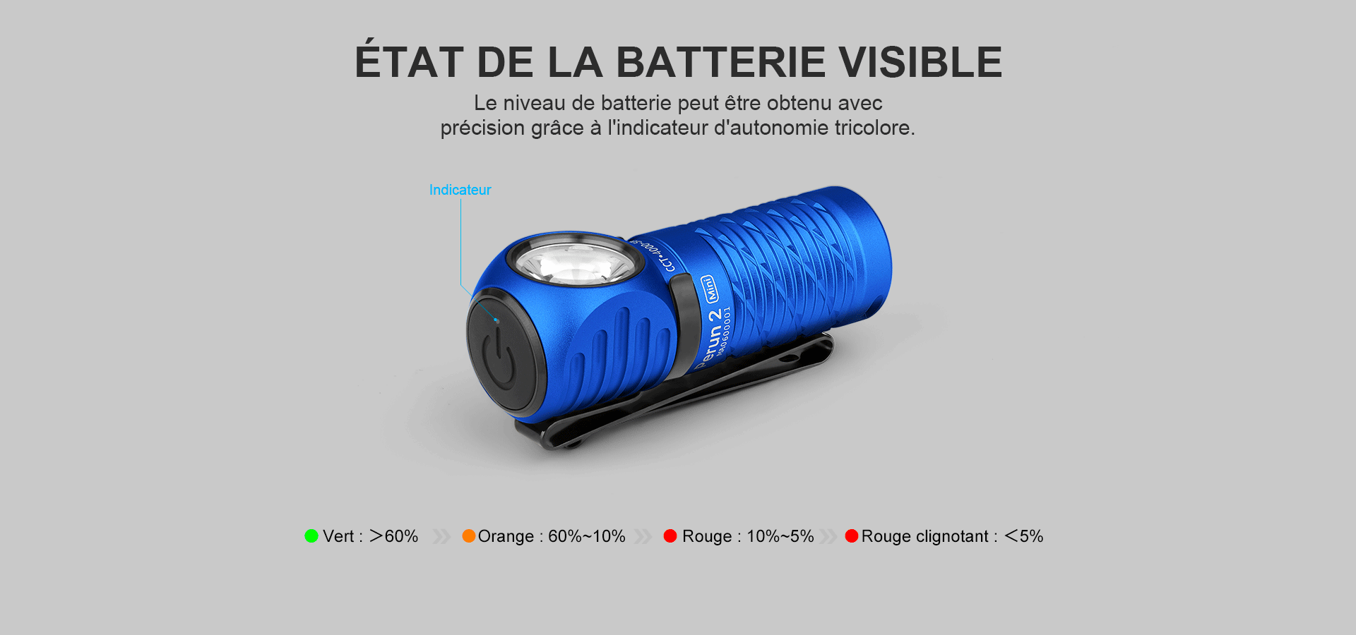- Indicateur de puissance tricolore : Suivez précisément le niveau de batterie grâce à son indicateur lumineux à trois couleurs :