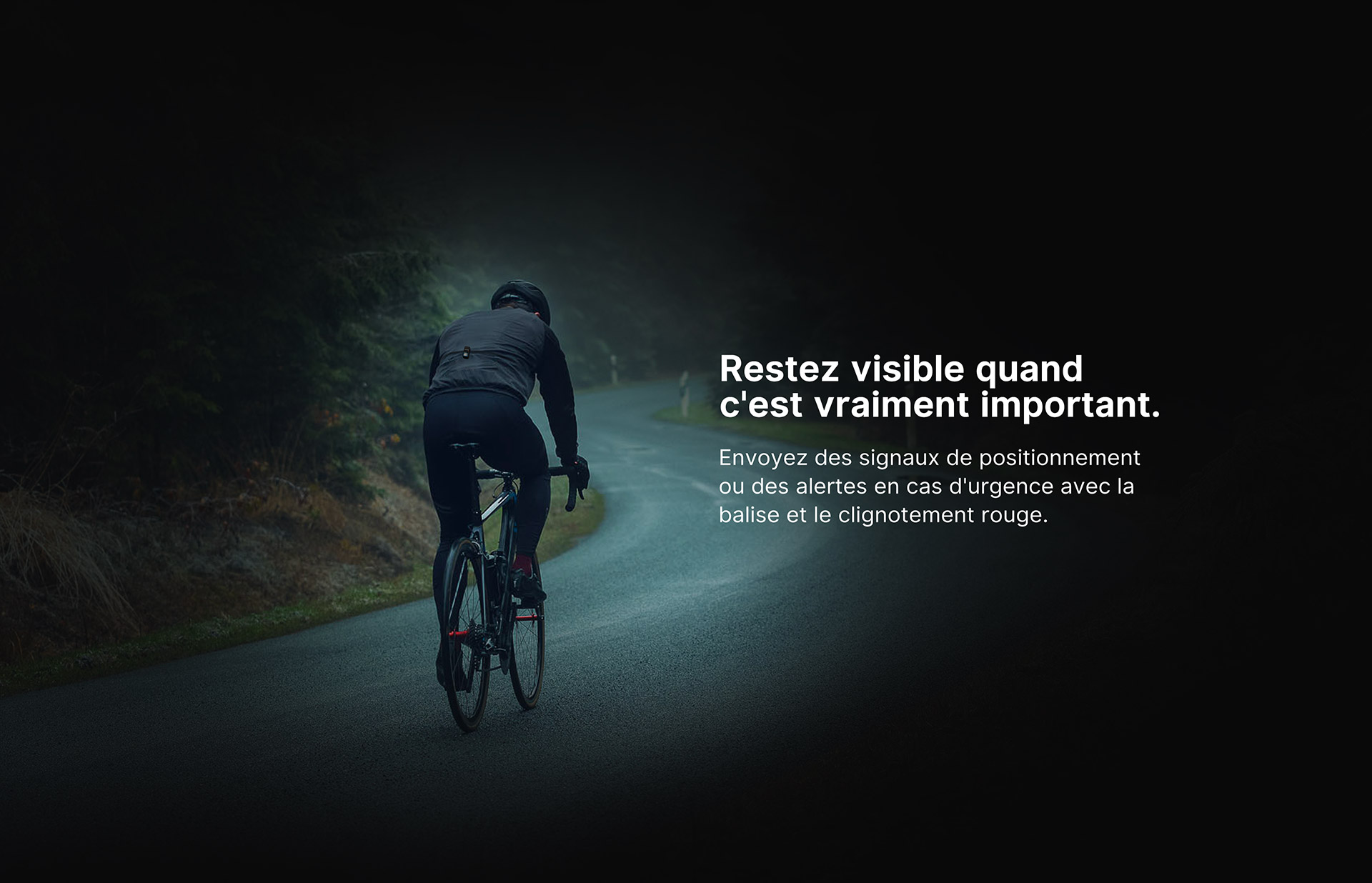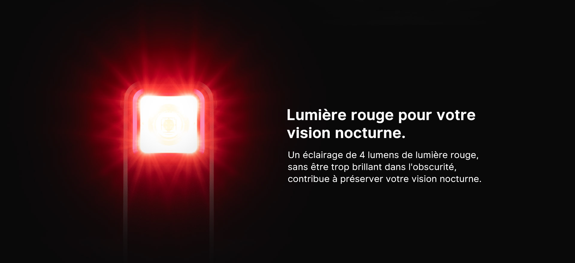 Deux sources lumineuses : lumière blanche pour usage quotidien et lumière rouge pour vision nocturne. Mode balise et clignotant pour la visibilité.