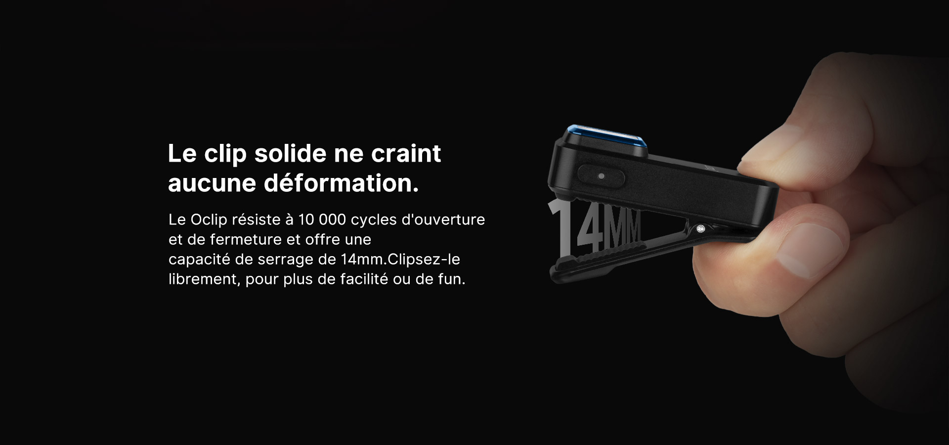 Design compact et léger : Avec un poids de seulement 30 g, une longueur de 48,5 mm et une largeur de 21 mm, la Oclip se transporte facilement et discrètement, idéale pour une utilisation EDC (Everyday Carry).