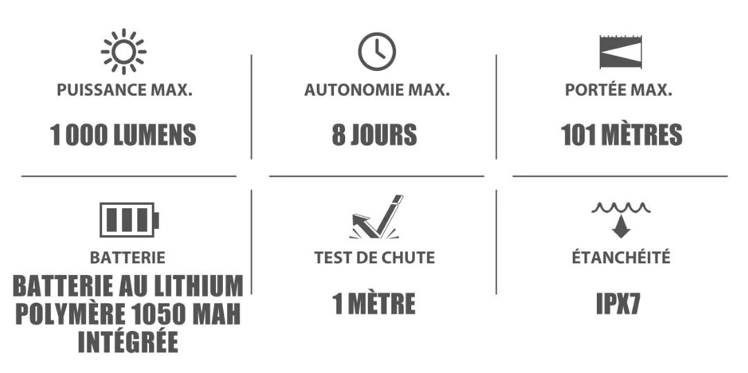 Turbo  1000lm pendant 4mins puis diminution progressive à 300lm pendant 110mins ; portée max. : 101m