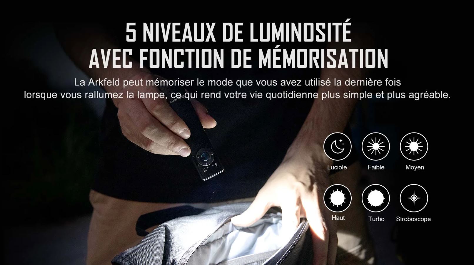 Rechargez-la facilement grâce à son câble magnétique. Avec son design plat et son excellente portabilité, la Arkfeld est une lampe EDC incontournable, alliant puissance, style et praticité pour vos besoins d’éclairage et au-delà.