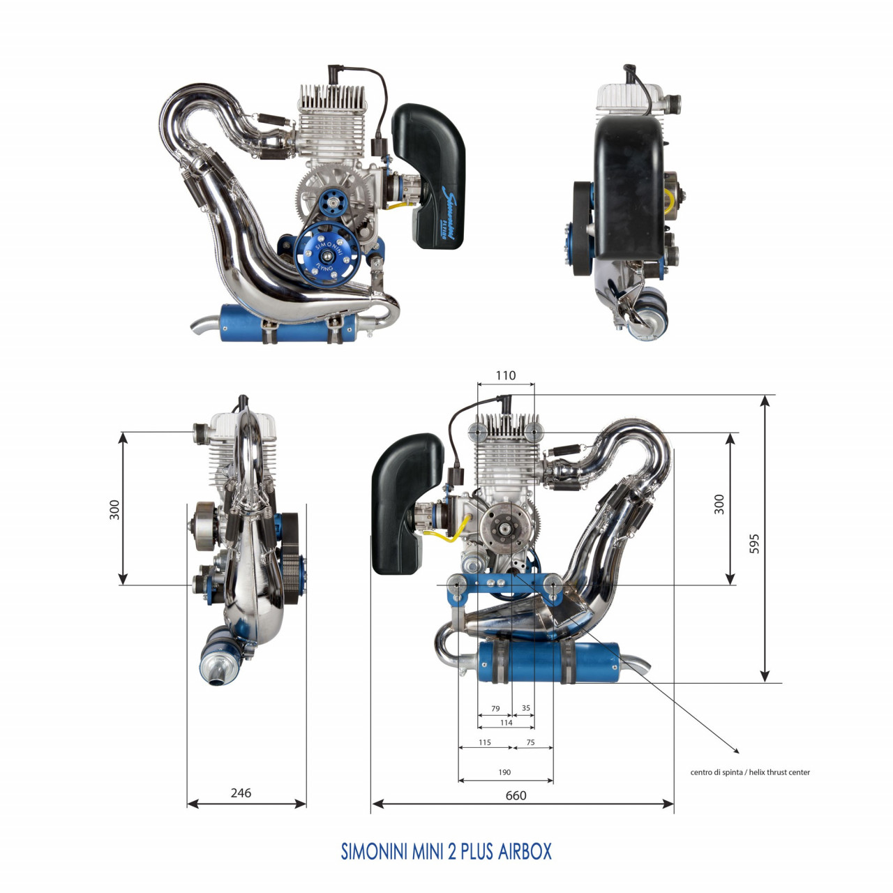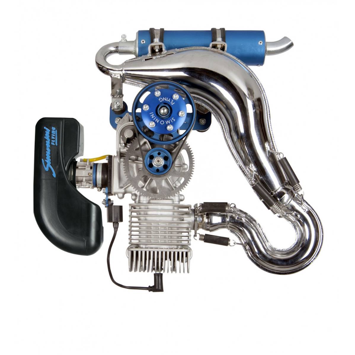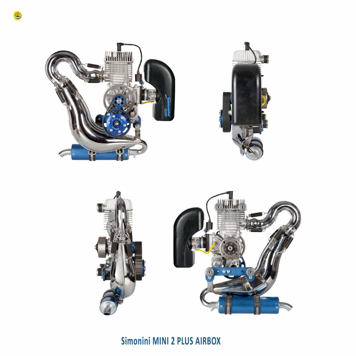 Moteur SIMONINI Mini 2 Plus complet comprenant : le réducteur à courroie Poly V avec démarreur électrique 250 W,le carburateur WALBRO WB 37 et filtre à air, le pot d'échappement et régulateur de charge 12 volts.