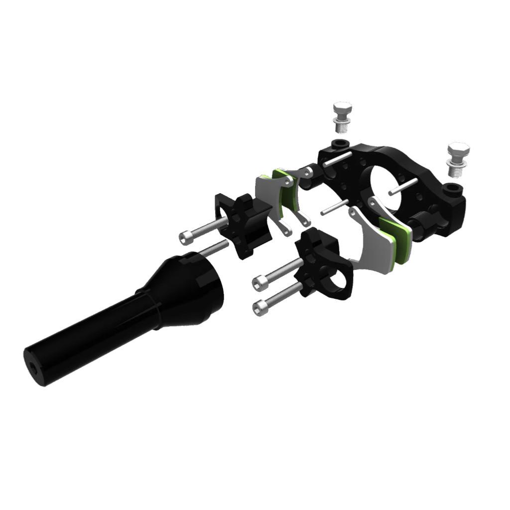 Assemblez la fusée au train avec 4 vis M8 classe 8.8 minimum de longueur adaptée à l’épaisseur de votre train. Ces vis doivent dépasser de 13mm de la jambe de train afin de traverser l’intégralité de l’embase de la fusée. Ces vis ne doivent pas dépasser de plus de 20mm de la jambe de train.