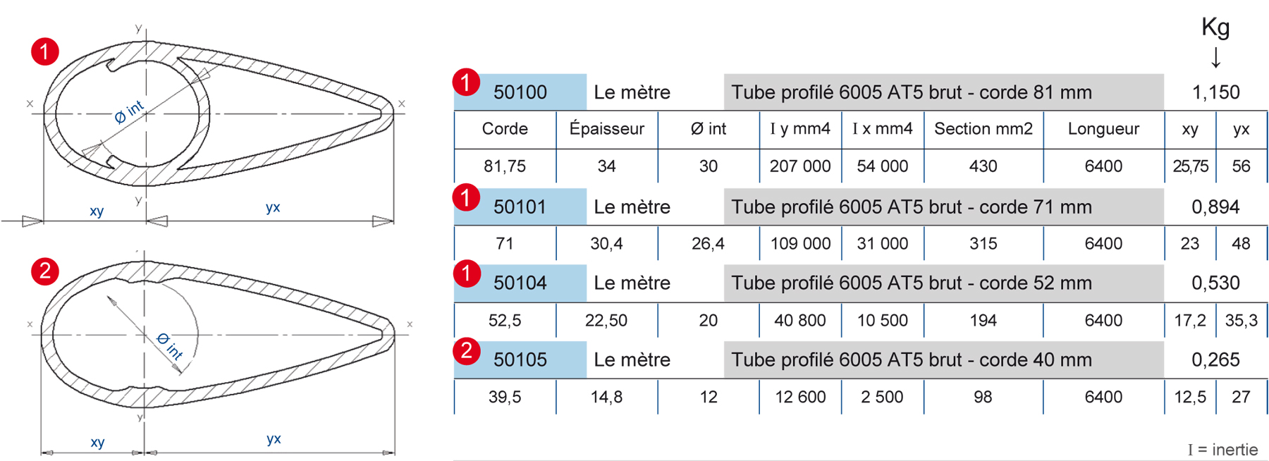 Tube profilé aluminium 6005 AT6 de corde 81 mm pour haubanage d'aile. Poids au mètre : 1,100 kg. Longueur du tube : 6.40m - Prix au mètre - Les chutes sont facturées.