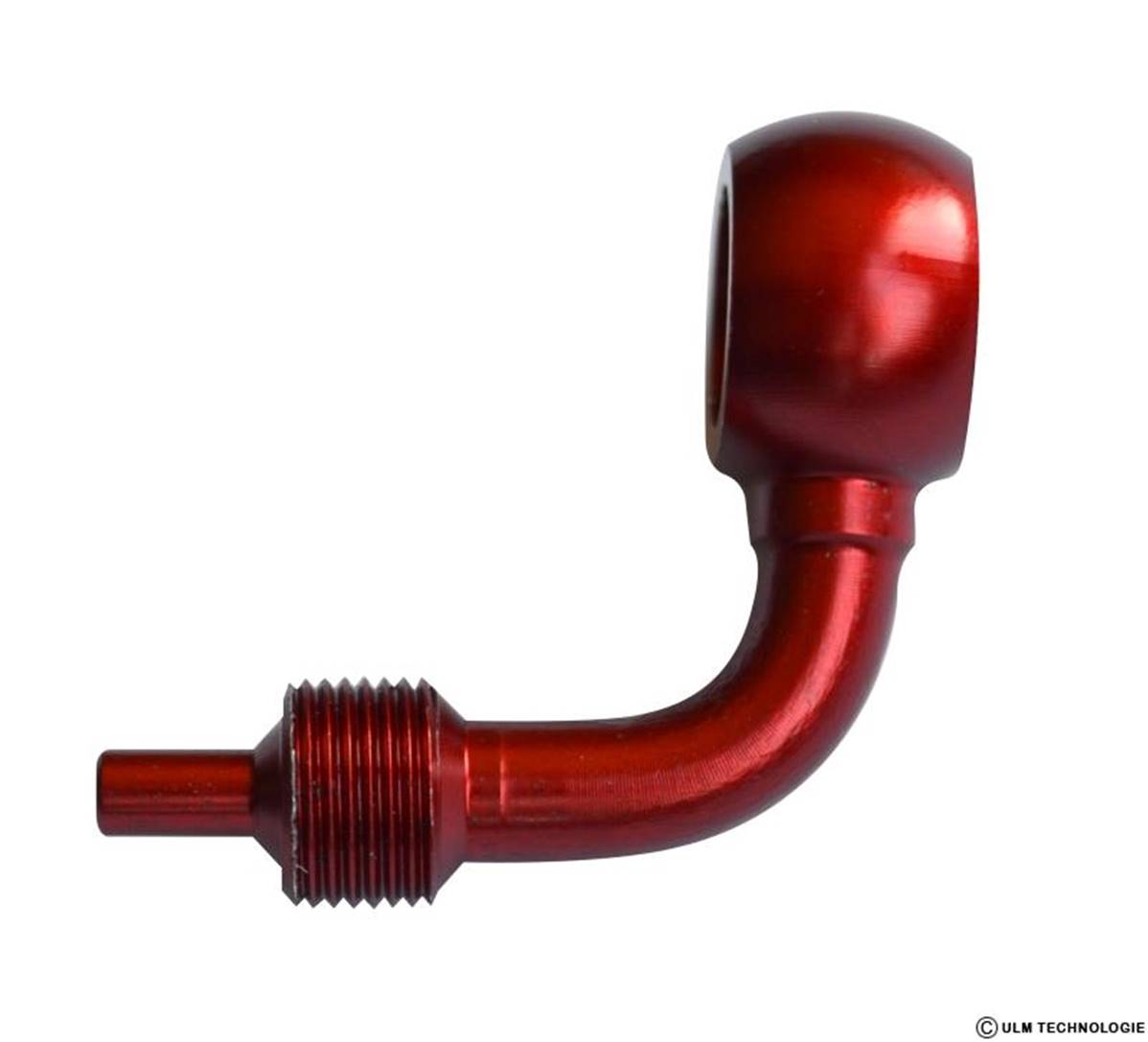 Raccord banjo à 90° perpendiculaire en aluminium anodisé.