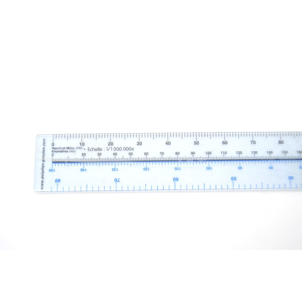 Spécialement conçue pour être utilisé avec des cartes au 1/500 000e (graduations bleues) ou au 1/1 000 000e (graduations noires), elle est graduée en km et en NM pour ces deux échelles. Elle permet ainsi, avec ses 32.5 cm de longueur, de tracer des navigations jusqu'à 300 km ou 162 NM sur des cartes au 1/1 000 000e.