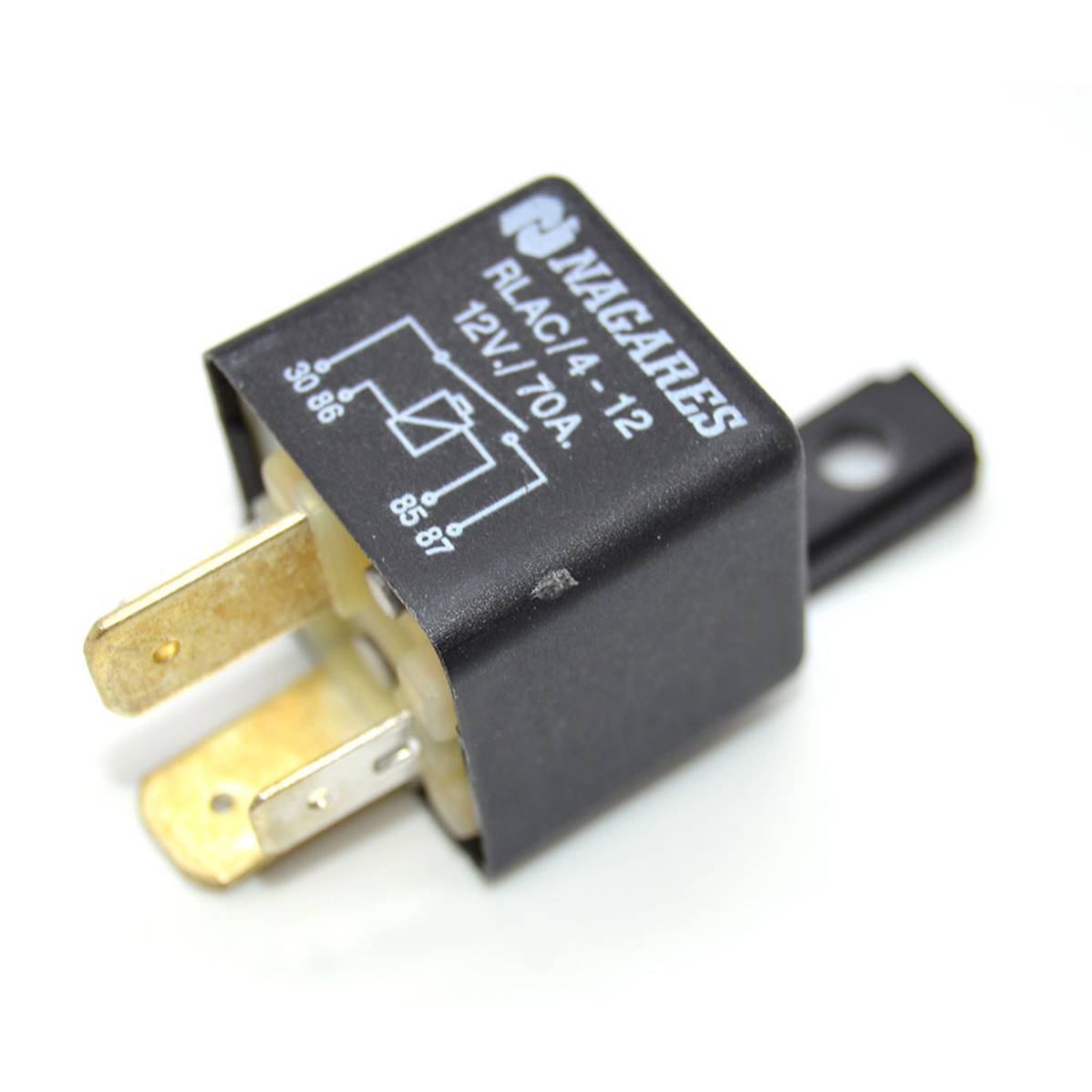 Relais 12 V - 70 A conçu pour la commande de circuits de forte puissance (pompe, démarreur auxiliaire, chauffage, ventilateur...). Fixation par languette métallique intégrée et raccordement via cosses plates, pour une intégration rapide dans un faisceau électrique embarqué.