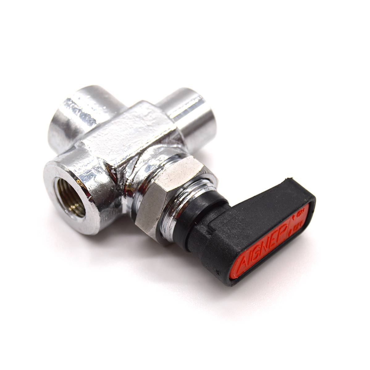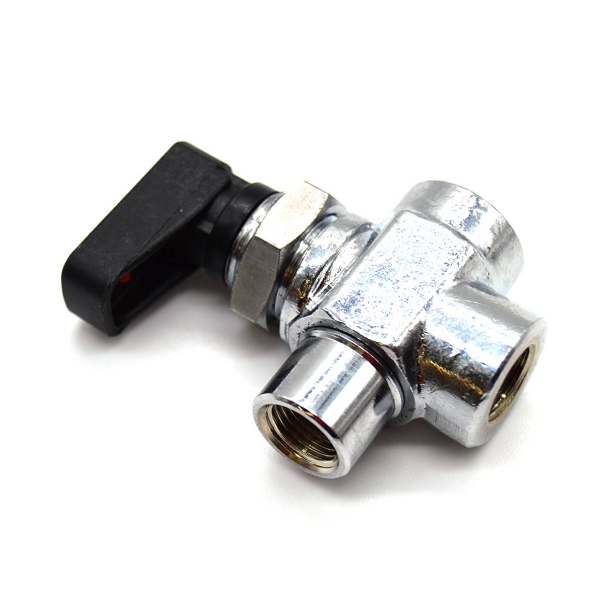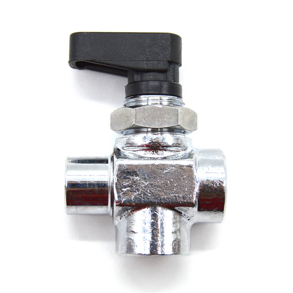 Robinet métal trois voies, permet de raccorder deux réservoirs et de choisir l'un ou l'autre ou fermer les deux en mettant la manette dans la position du milieu.