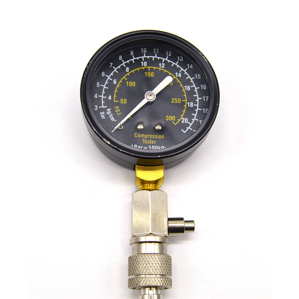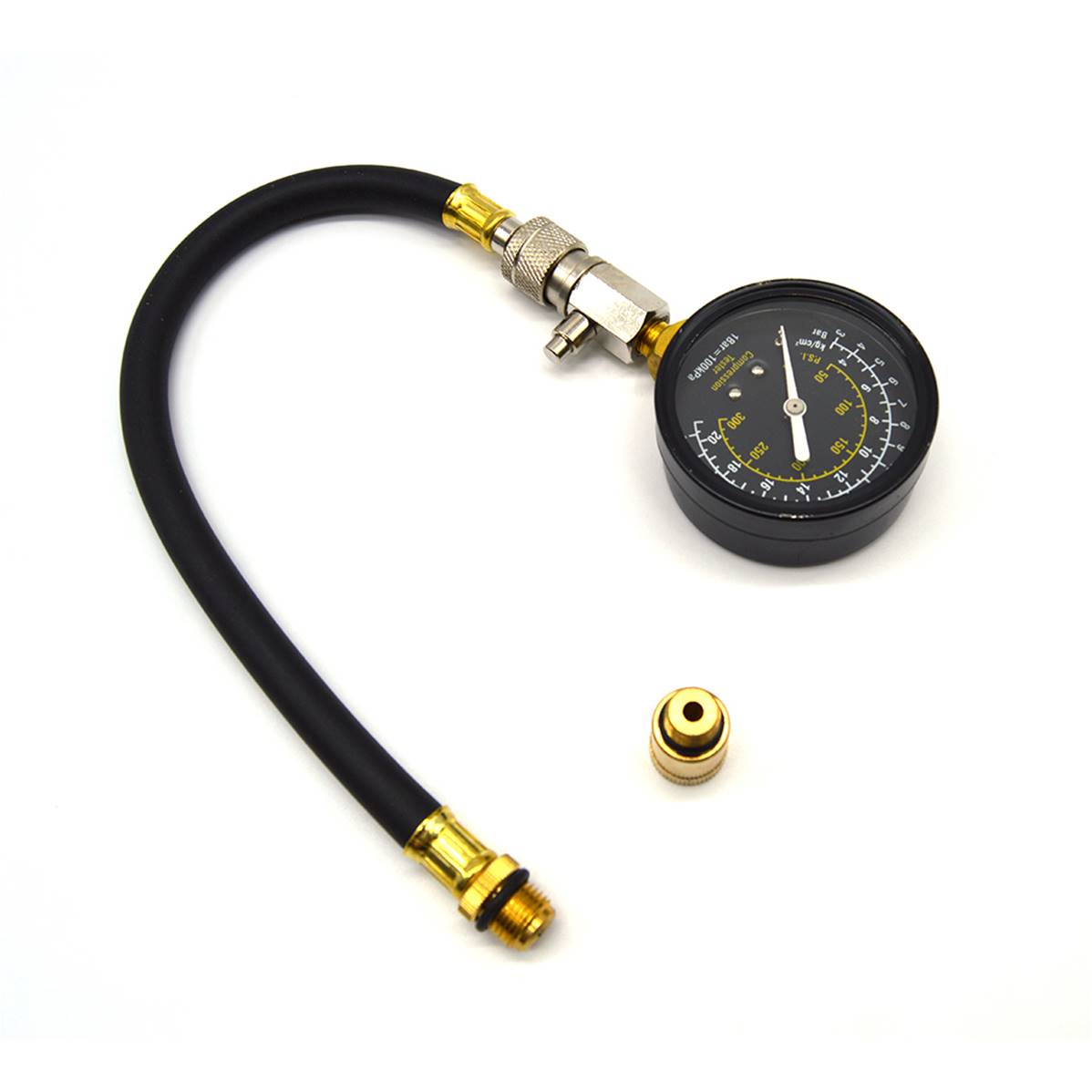 Testeur de compression avec tuyau flexible de 300 mm équipé d'un adaptateur 12 mm /14 mm. Possède un grand cadran (Ø 50 mm ) permettant d'afficher la pression en bars d'une façon très lisible de 0 à 21 bars.